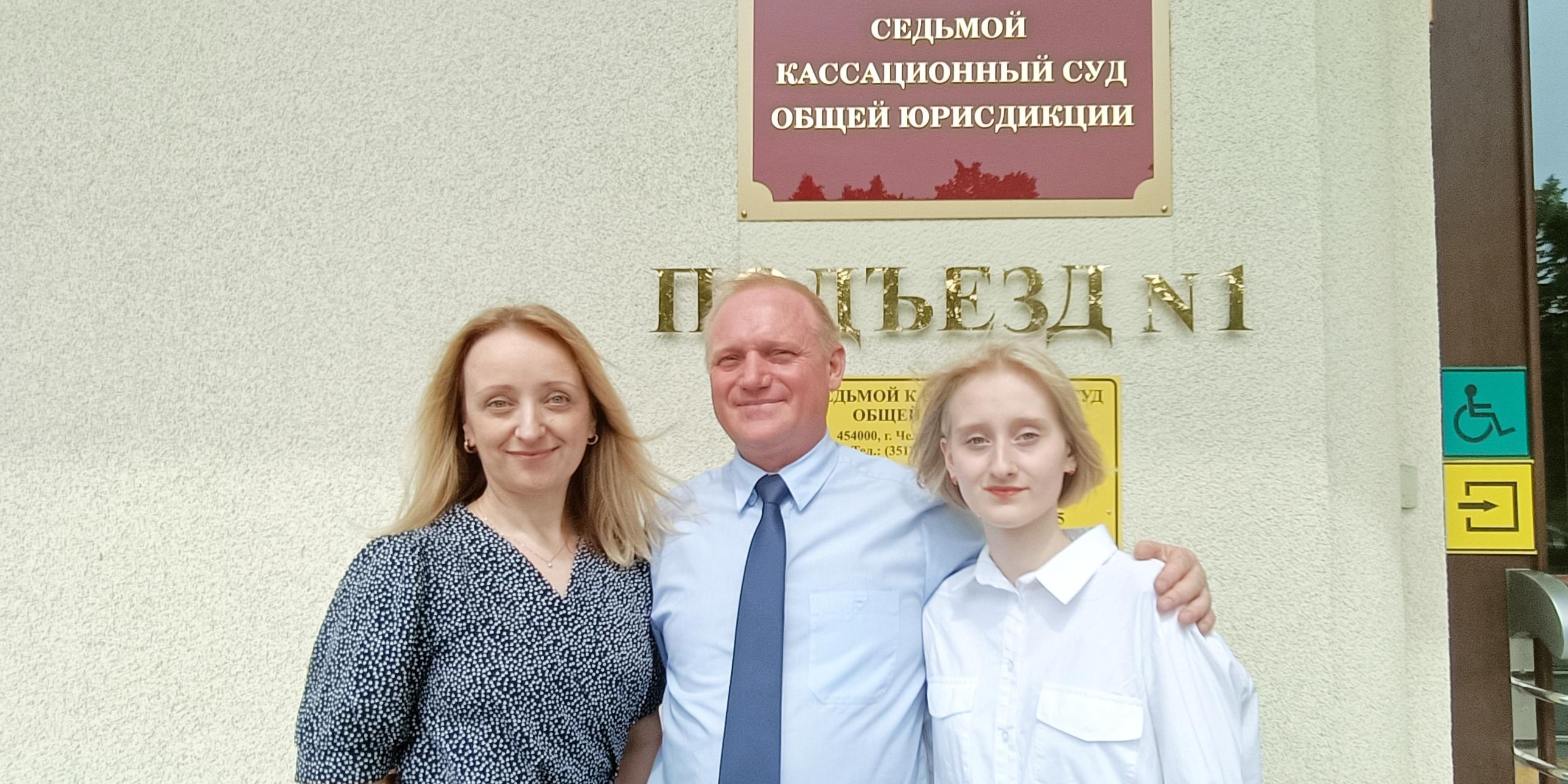 Pavel Popov vaimonsa ja tyttärensä kanssa seitsemännen yleisen tuomioistuimen rakennuksen ulkopuolella Tšeljabinskissa (toukokuu 2023)