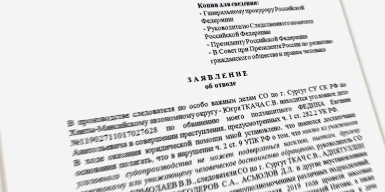 Am 20. Februar 2019 wurde beim Büro des Ermittlungskomitees Russlands ein Antrag auf Disqualifikation des Ermittlungsteams für den Autonomen Kreis der Chanten-Mansen-Jugra eingereicht, da hinreichende Gründe für die Annahme vorliegen, dass der Leiter der Ermittlungsabteilung der Stadt Surgut Ermolaev V.V., die Ermittler Tkach S.V., Adiyatullin A.F., Gaisin S.S., Bogoderov S.A., Asmolov D.L. und andere Vertreter der Strafverfolgungsbehörden folterten inhaftierte Zeugen Jehovas.
