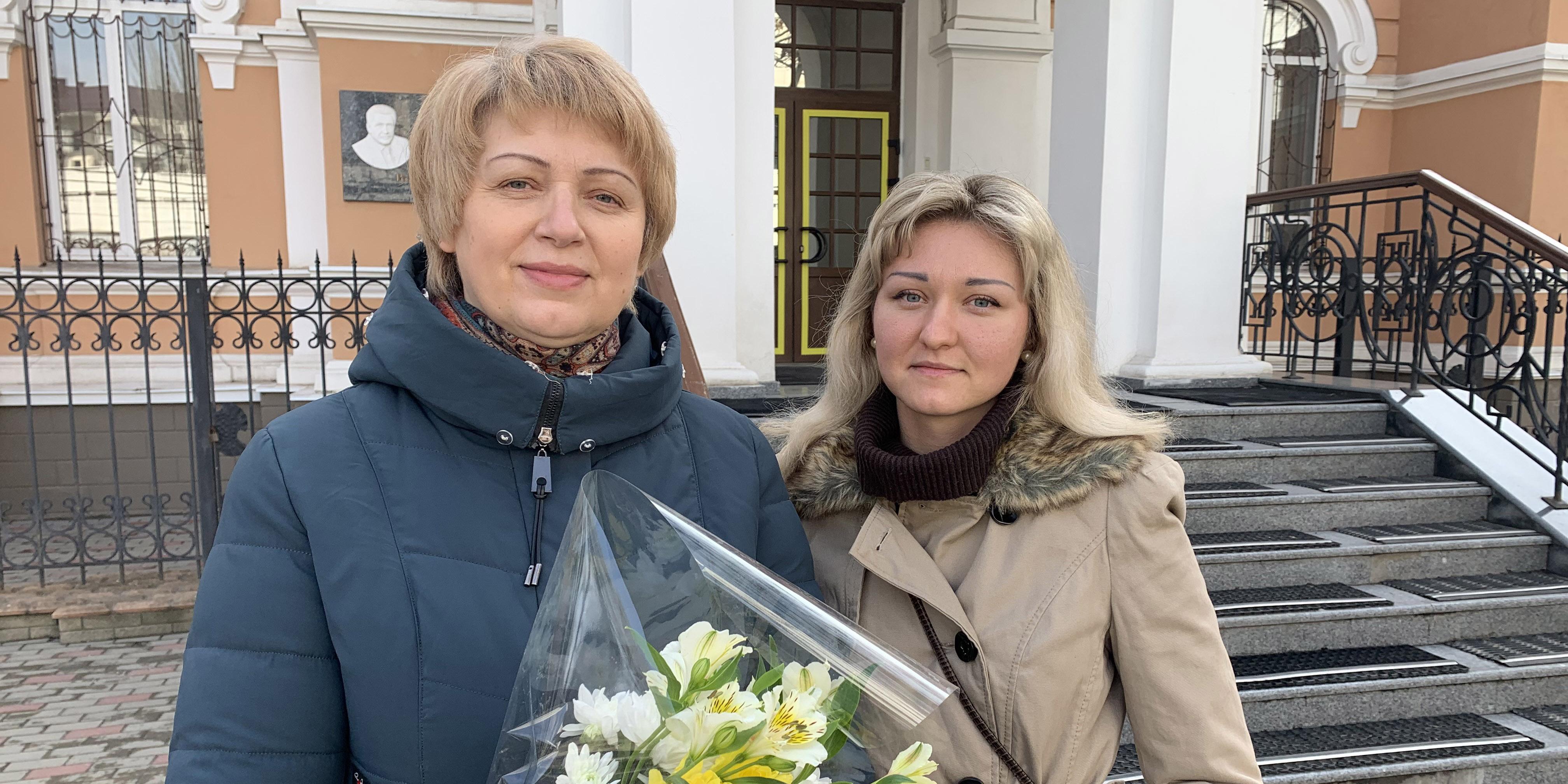 Auf dem Foto: Galina Parkova mit ihrer Tochter Evgenia in der Nähe des Gebäudes des Bezirksgerichts Rostow am Don, März 2021