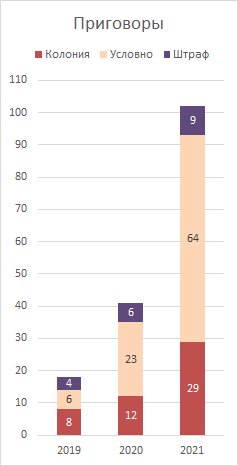 2021년에 얼마나 많은 신앙에 대한 확신이 내려졌고, 얼마나 많은 것이 효력을 발휘했는가? 2021년 12월 31일 현재, 지난 4년 동안 170명의 남성과 여성이 신앙 때문에 유죄 판결을 받았습니다. 2021년 한 해 동안 111명이 러시아 연방 형법 282.2조에 따라 유죄 판결을 받고 1심 법원에서 다양한 처벌을 선고받았습니다. (2019년에는 이 수치가 18명, 2020년에는 39명이었습니다.) 이 중 46명은 항소심 판결을 기다리고 있다. 85명의 신자에 대해서는 2021년에 항소심이 열렸고 선고가 발효되었습니다. (2019년에는 이 수치가 10명, 2020년에는 23명이었습니다.) 어떤 경우에는 처벌이 완화되거나 강화되었지만, 대부분의 경우 형벌은 변하지 않았다. 2021년에는 러시아 연방 형법 제282.2조 1항에 따라 기소된 신자에 대해 1건의 무죄 판결이 있었습니다. 무죄 판결은 아직 발효되지 않았다.