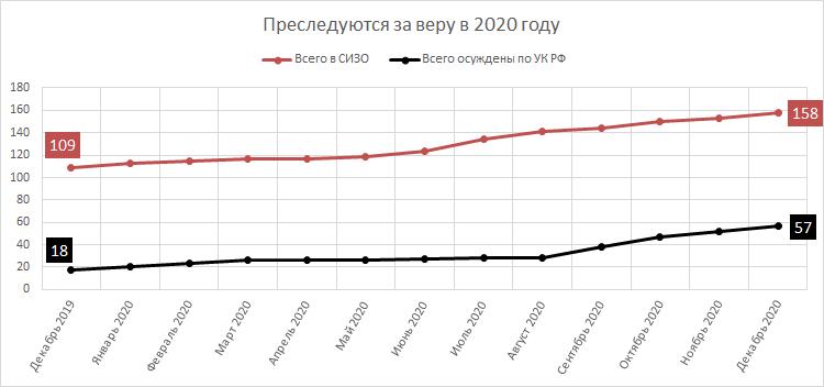 Quantas Testemunhas de Jeová passaram por centros de detenção temporária, centros de detenção provisória ou colônias penais e quantas ainda estão detidas lá. Um total de 221 fiéis foram mandados para trás das grades desde maio de 2017. Durante o ano de 2020, 49 fiéis foram colocados em prisão preventiva (SIZO) e outros 23 passaram alguns dias cada um em um TDF, mas receberam uma medida de contenção não privativa de liberdade. Assim, durante o ano, 72 fiéis acabaram detidos. (Em 2019, o número era de 84.) Em 30 de dezembro de 2020, 46 pessoas permaneciam atrás das grades, incluindo 36 em centros de detenção provisória e 10 em colônias penais.