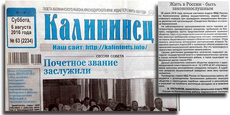 2016年7月30日,在喀里宁斯卡亚村(克拉斯诺达尔边疆区),警察阻止了1600多名耶和华见证人参加的大型礼拜活动受到干扰。stanitsa报纸报道了警方的协调行动。